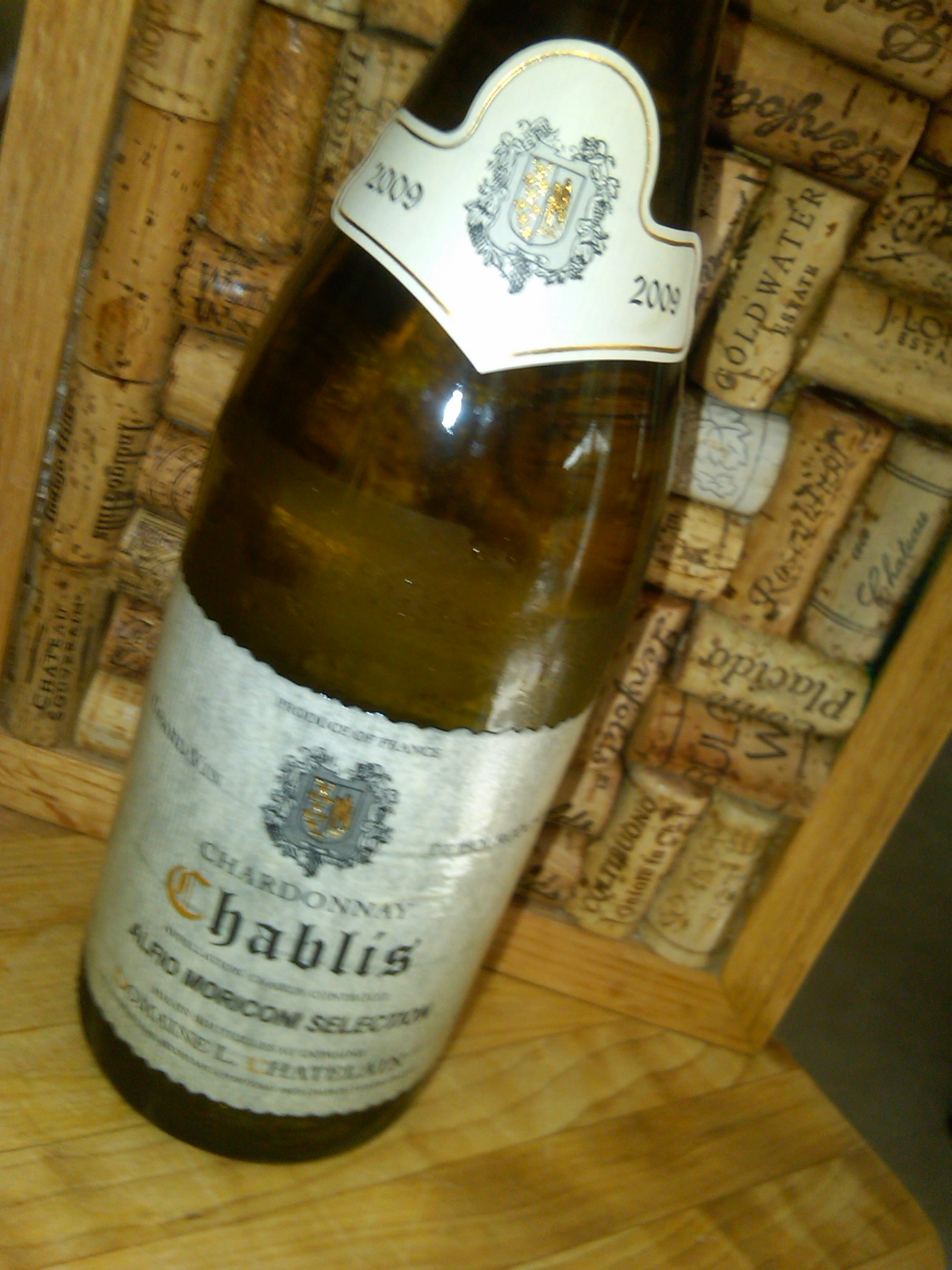 2009 Domaine Chatelain. Georgeous straw color with lively lemon and mineral essence on the nose. Going in for a taste, there is a lot of fresh fruit, melon and lemon zest. The dry clean finish is unmistakably one of a quality Chablis.