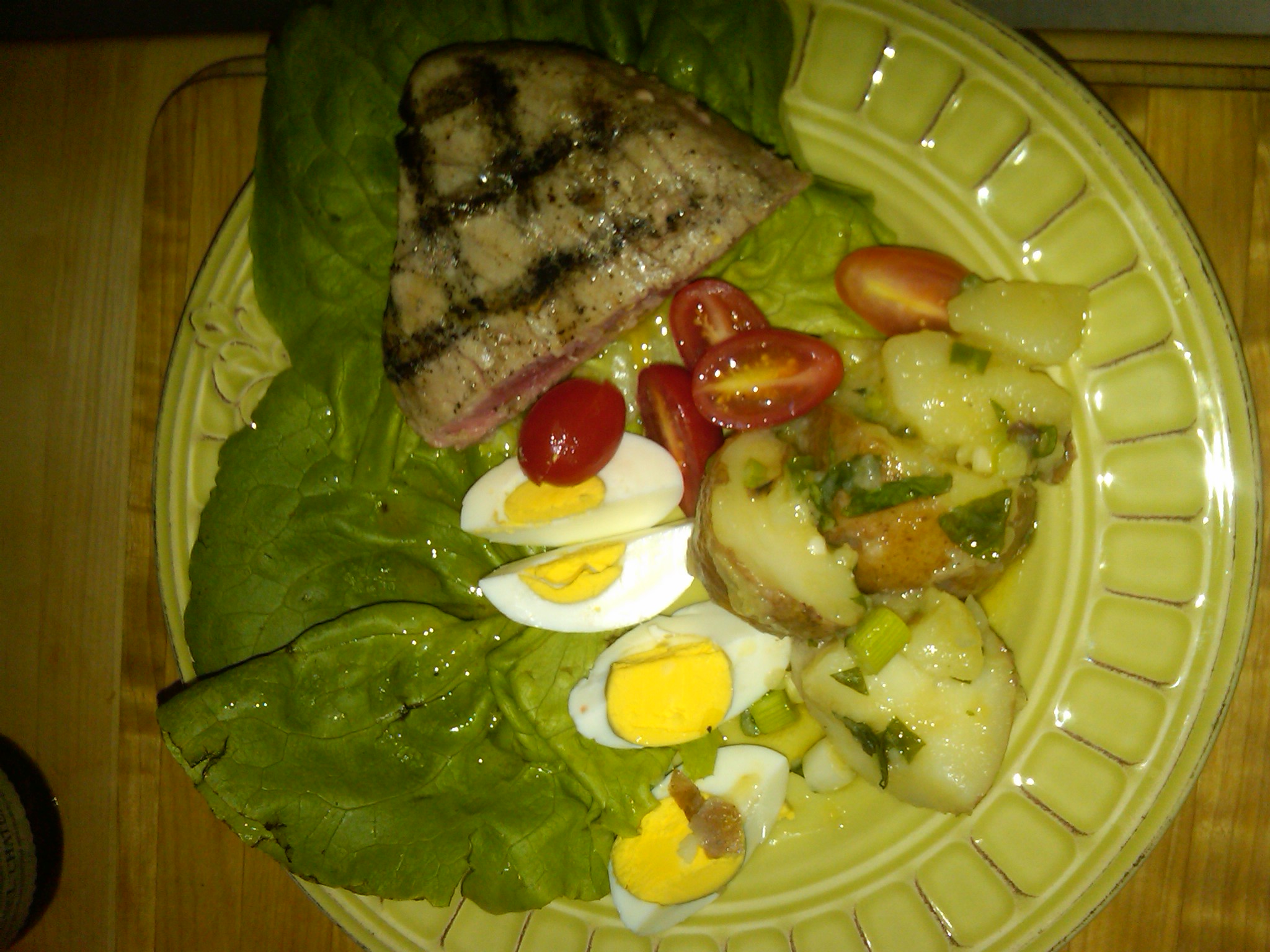 we are having a traditional Niçoise salad (pronounced ni’swaz). Beautiful grilled tuna steak with fresh salad, hard boiled eggs, French potato salad topped with Champagne Vinaigrette dressing.